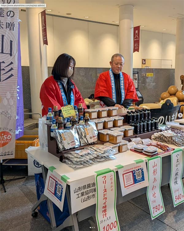 霞城セントラル1階アトリウムで山形県醤油味噌工業協同組合による即売会を開催しています。